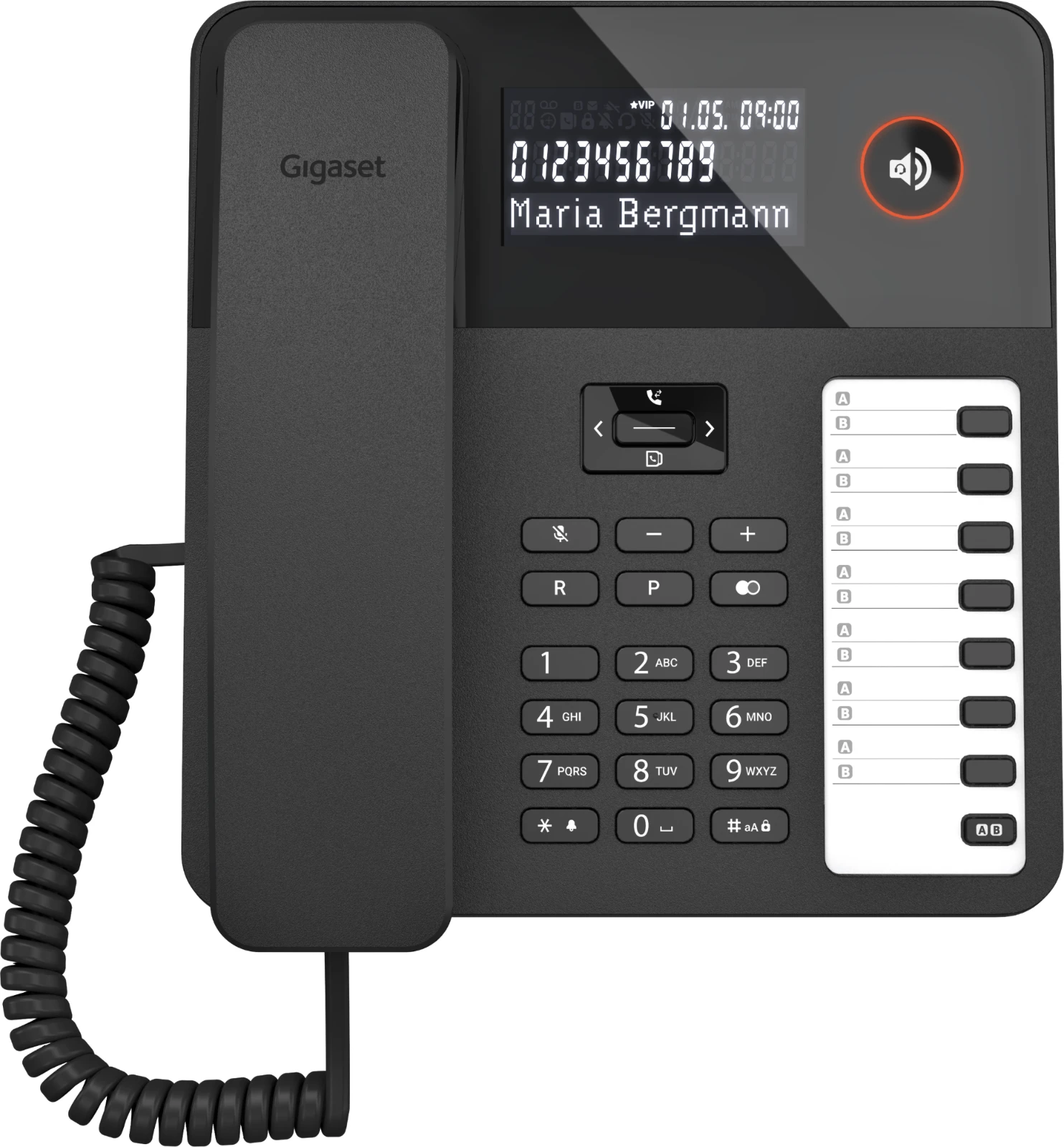 Das Gigaset DESK 600 verfügt über ein dreizeiliges LC-Display mit LED-Hintergrundbeleuchtung, das Rufnummer, Name,Gesprächszeit und VIP-Status (sofern zugeteilt) des Anrufers anzeigt. Der Startbildschirm informiert zudem über das Datum, die Uhrzeit und den Wochentag.